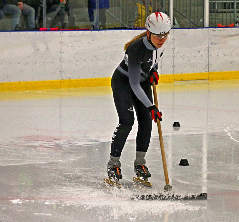 While the Manitoba Junior Hockey (MJHL) players waited in their locker rooms during the first intermission, the skaters of the Eastman Speed Skating Club went out for a series of demo races on a freshly flooded ice surface.